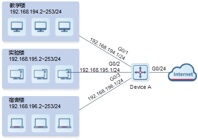 ijѧУͨ¹ýDevice AµÄG0/24ÉÏÁªInternet£¬£¬£¬£¬£¬Device AµÄG0/1¡¢G0/2ºÍG0/3»®·ÖÏÂÁªµÄ½Ìѧ¥(192.168.194.2~253/24)¡¢ÊµÑéÂ¥(192.168.195.2~253/24)ºÍËÞÉáÂ¥(192.168.196.2~253/24)¡£¡£¡£¡£¡£
