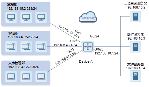 Ñз¢²¿(192.168.45.2~253/24)¡¢Êг¡²¿(192.168.46.2~253/24)ºÍÈËÊÂÖÎÀí²¿(192.168.47.2~253/24)»®·Ö½ÓÈëDevice AµÄ½Ó¿ÚG0/1¡¢G0/2ºÍG0/3£»£»£»£»£»ÈËΪÅÌÎÊ·þÎñÆ÷(192.168.10.2/24)¡¢Óʼþ·þÎñÆ÷(192.168.10.3/24)ºÍÎļþ·þÎñÆ÷(192.168.10.4/24)ÅþÁ¬ÔÚDevice AµÄ½Ó¿ÚG0/23¡£¡£¡£¡£¡£
